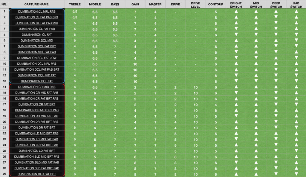 Paczka dwudziestu ośmiu ujęć brzmieniowych CGT DUMBNATION. 16 profil brzmień czystych w wersji CLEAN oraz CRUNCH, 12 profili brzmień przesterowanych typu DRIVE oraz LEAD.