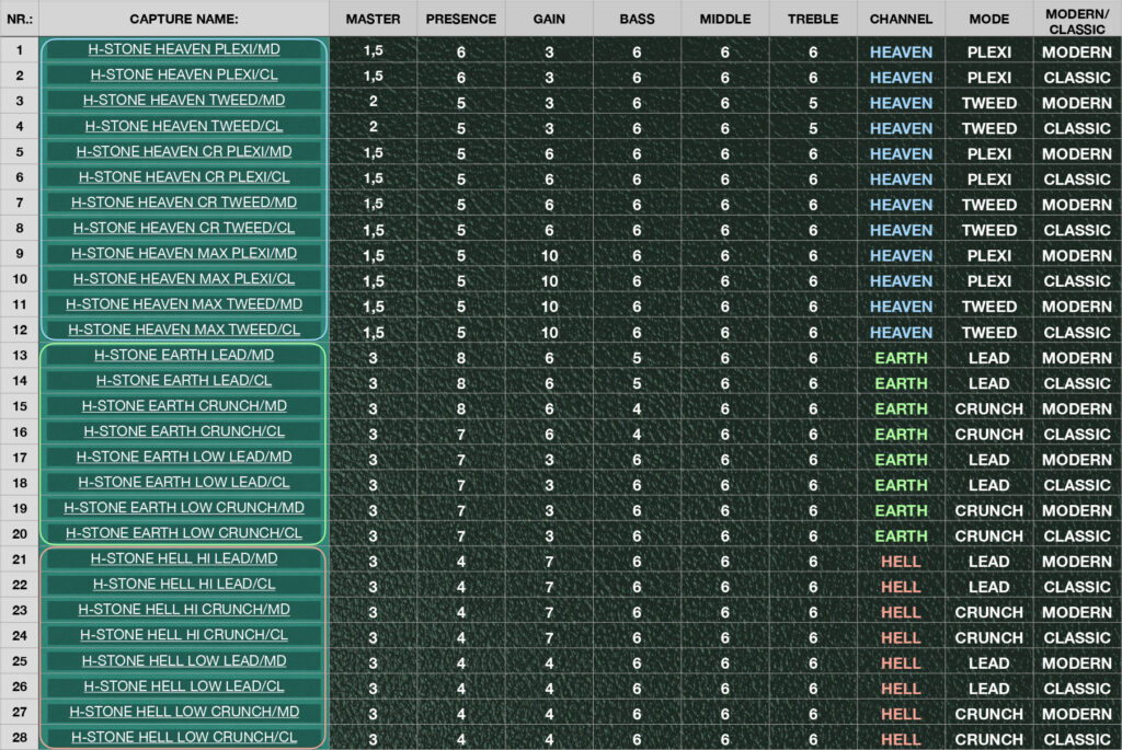Paczka dwudziestu ośmiu ujęć brzmieniowych  CGT H-STONE PRODIGY.  12 profil w wersji HEAVEN, 8 profili w wersji EARTH oraz 8 profili w wersji HELL.